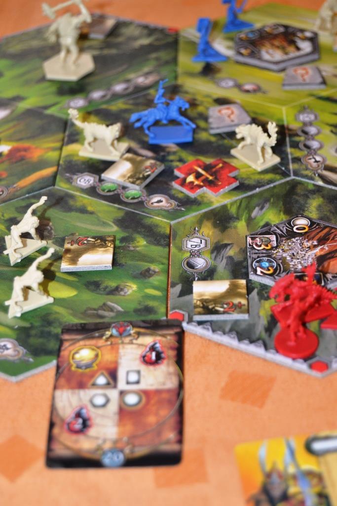I failed to tell, the purpose of the game is to find seven Dragon Runes. You can see there are some tokens on the tiles marked with an interrogation mark. Some of them contain actual Runes, some of them don't. The player controlling the tile can check if he has control of a Rune or a fake icon. The first one to get seven Runes (by whatever means) will win the game (that actually explains the name of the game itself!). If no one gets to that point, by the end of the seventh year of war, the player with more Runes will win (Seven years!!).
